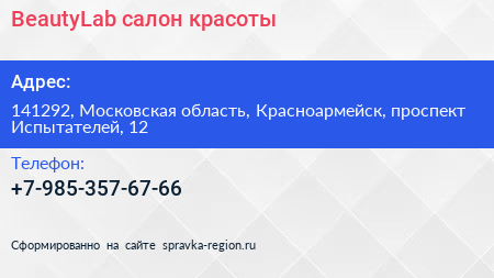 BeautyLab, салон красоты по адресу 141292, Московская область, Красноармейск, проспект Испытателей, 12 в дальнейшем Организация, размещена в следующих категориях: