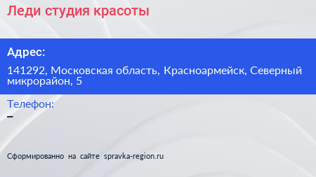 Леди, студия красоты по адресу 141292, Московская область, Красноармейск, Северный микрорайон, 5 в дальнейшем Организация, размещена в следующих категориях:
