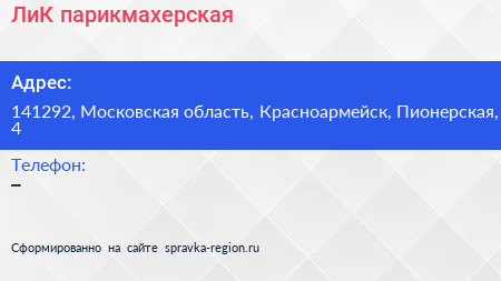 ЛиК, парикмахерская по адресу 141292, Московская область, Красноармейск, Пионерская, 4 в дальнейшем Организация, размещена в следующих категориях: