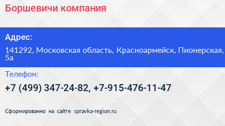 Боршевичи, компания по адресу 141292, Московская область, Красноармейск, Пионерская, 5а в дальнейшем Организация, размещена в следующих категориях: