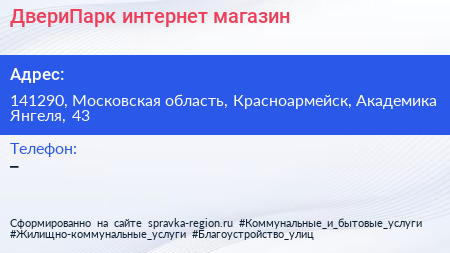 ДвериПарк, интернет-магазин по адресу 141290, Московская область, Красноармейск, Академика Янгеля, 43 в дальнейшем Организация, размещена в следующих категориях: