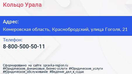 Кольцо Урала по адресу Кемеровская область, Краснобродский, улица Гоголя, 21 в дальнейшем Организация, размещена в следующих категориях:
