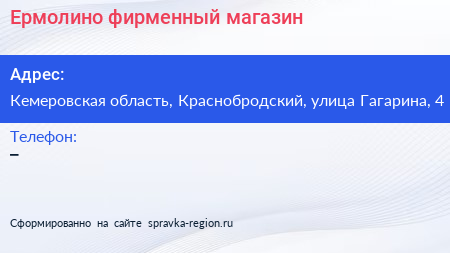 Ермолино, фирменный магазин по адресу Кемеровская область, Краснобродский, улица Гагарина, 4 в дальнейшем Организация, размещена в следующих категориях:
