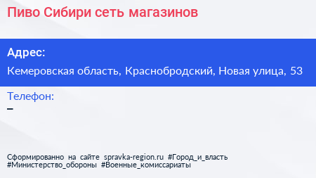Пиво Сибири, сеть магазинов по адресу Кемеровская область, Краснобродский, Новая улица, 53 в дальнейшем Организация, размещена в следующих категориях: