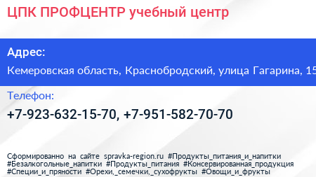 ЦПК ПРОФЦЕНТР, учебный центр по адресу Кемеровская область, Краснобродский, улица Гагарина, 15 в дальнейшем Организация, размещена в следующих категориях: