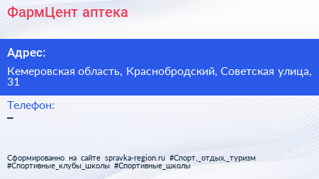 ФармЦент, аптека по адресу Кемеровская область, Краснобродский, Советская улица, 31 в дальнейшем Организация, размещена в следующих категориях: