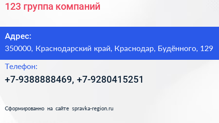 123, группа компаний по адресу 350000, Краснодарский край, Краснодар, Будённого, 129 в дальнейшем Организация, размещена в следующих категориях: