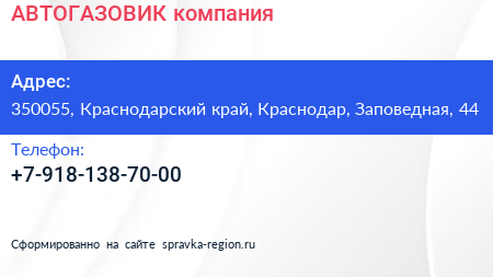 АВТОГАЗОВИК, компания по адресу 350055, Краснодарский край, Краснодар, Заповедная, 44 в дальнейшем Организация, размещена в следующих категориях: