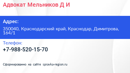 Адвокат Мельников Д.И. по адресу 350040, Краснодарский край, Краснодар, Димитрова, 164/1 в дальнейшем Организация, размещена в следующих категориях: