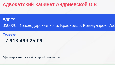 Адвокатский кабинет Андриевской О.В. по адресу 350020, Краснодарский край, Краснодар, Коммунаров, 266 в дальнейшем Организация, размещена в следующих категориях: