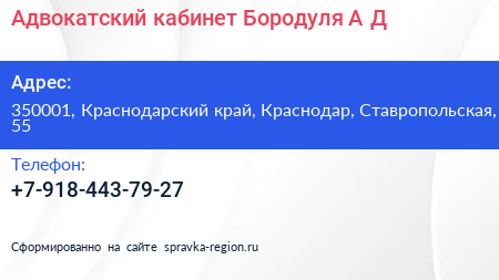 Адвокатский кабинет Бородуля А.Д. по адресу 350001, Краснодарский край, Краснодар, Ставропольская, 55 в дальнейшем Организация, размещена в следующих категориях: