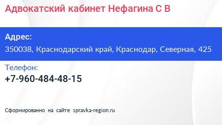 Адвокатский кабинет Нефагина С.В. по адресу 350038, Краснодарский край, Краснодар, Северная, 425 в дальнейшем Организация, размещена в следующих категориях: