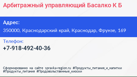 Арбитражный управляющий Басалко К.Б. по адресу 350000, Краснодарский край, Краснодар, Фрунзе, 169 в дальнейшем Организация, размещена в следующих категориях: