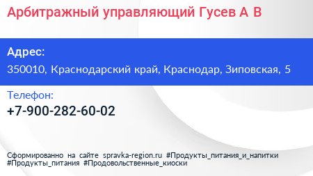 Арбитражный управляющий Гусев А.В. по адресу 350010, Краснодарский край, Краснодар, Зиповская, 5 в дальнейшем Организация, размещена в следующих категориях: