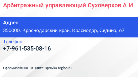 Арбитражный управляющий Суховерхов А.И. по адресу 350000, Краснодарский край, Краснодар, Седина, 67 в дальнейшем Организация, размещена в следующих категориях: