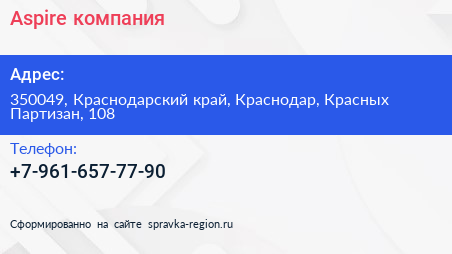 Aspire, компания по адресу 350049, Краснодарский край, Краснодар, Красных Партизан, 108 в дальнейшем Организация, размещена в следующих категориях: