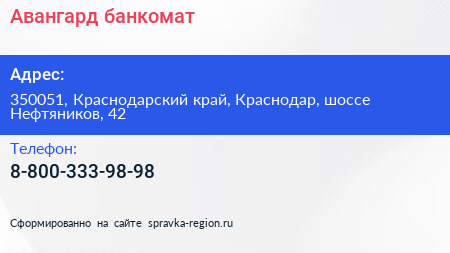 Авангард, банкомат по адресу 350051, Краснодарский край, Краснодар, шоссе Нефтяников, 42 в дальнейшем Организация, размещена в следующих категориях: