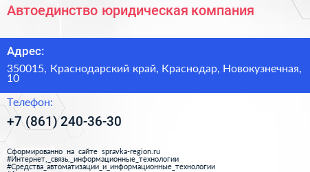 Автоединство, юридическая компания по адресу 350015, Краснодарский край, Краснодар, Новокузнечная, 10 в дальнейшем Организация, размещена в следующих категориях: