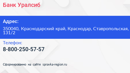 Банк Уралсиб по адресу 350040, Краснодарский край, Краснодар, Ставропольская, 131/2 в дальнейшем Организация, размещена в следующих категориях: