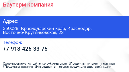 Баутерм, компания по адресу 350028, Краснодарский край, Краснодар, Восточно-Кругликовская, 22 в дальнейшем Организация, размещена в следующих категориях:
