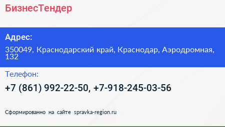 БизнесТендер по адресу 350049, Краснодарский край, Краснодар, Аэродромная, 132 в дальнейшем Организация, размещена в следующих категориях: