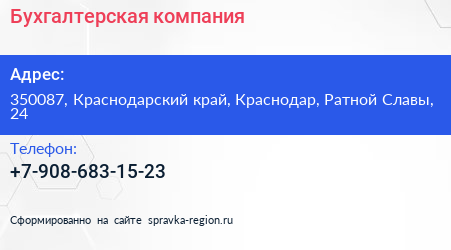 Бухгалтерская компания по адресу 350087, Краснодарский край, Краснодар, Ратной Славы, 24 в дальнейшем Организация, размещена в следующих категориях: