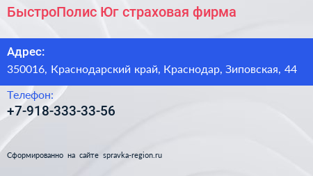 БыстроПолис Юг, страховая фирма по адресу 350016, Краснодарский край, Краснодар, Зиповская, 44 в дальнейшем Организация, размещена в следующих категориях: