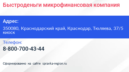 Быстроденьги, микрофинансовая компания по адресу 350080, Краснодарский край, Краснодар, Тюляева, 37/5 киоск в дальнейшем Организация, размещена в следующих категориях: