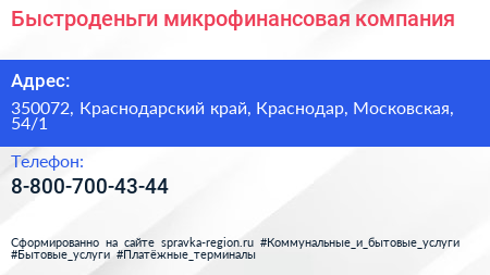 Быстроденьги, микрофинансовая компания по адресу 350072, Краснодарский край, Краснодар, Московская, 54/1 в дальнейшем Организация, размещена в следующих категориях: