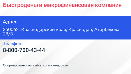 Быстроденьги, микрофинансовая компания по адресу 350062, Краснодарский край, Краснодар, Атарбекова, 28/3 в дальнейшем Организация, размещена в следующих категориях: