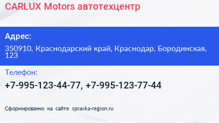 CARLUX Motors, автотехцентр по адресу 350910, Краснодарский край, Краснодар, Бородинская, 123 в дальнейшем Организация, размещена в следующих категориях: