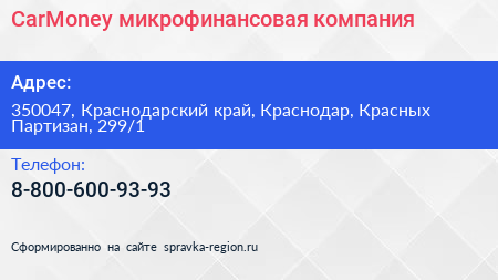 CarMoney, микрофинансовая компания по адресу 350047, Краснодарский край, Краснодар, Красных Партизан, 299/1 в дальнейшем Организация, размещена в следующих категориях: