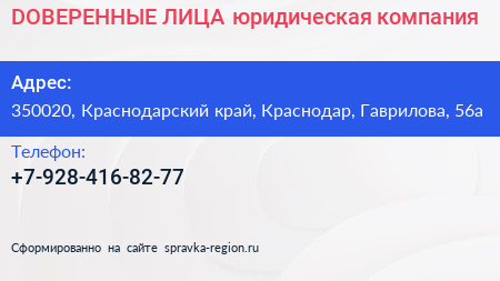 DОВЕРЕННЫЕ ЛИЦА, юридическая компания по адресу 350020, Краснодарский край, Краснодар, Гаврилова, 56а в дальнейшем Организация, размещена в следующих категориях: