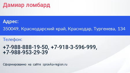 Дамиар-ломбард по адресу 350049, Краснодарский край, Краснодар, Тургенева, 134 в дальнейшем Организация, размещена в следующих категориях: