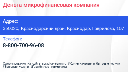 Деньга, микрофинансовая компания по адресу 350020, Краснодарский край, Краснодар, Гаврилова, 107 в дальнейшем Организация, размещена в следующих категориях: