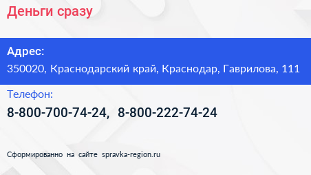 Деньги сразу по адресу 350020, Краснодарский край, Краснодар, Гаврилова, 111 в дальнейшем Организация, размещена в следующих категориях: