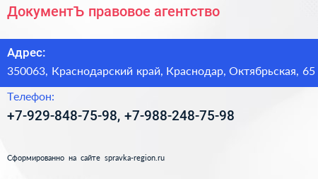 ДокументЪ, правовое агентство по адресу 350063, Краснодарский край, Краснодар, Октябрьская, 65 в дальнейшем Организация, размещена в следующих категориях: