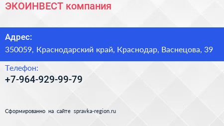 ЭКОИНВЕСТ, компания по адресу 350059, Краснодарский край, Краснодар, Васнецова, 39 в дальнейшем Организация, размещена в следующих категориях:
