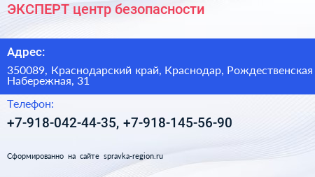 ЭКСПЕРТ, центр безопасности по адресу 350089, Краснодарский край, Краснодар, Рождественская Набережная, 31 в дальнейшем Организация, размещена в следующих категориях: