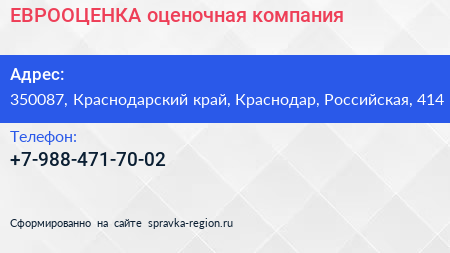 ЕВРООЦЕНКА, оценочная компания по адресу 350087, Краснодарский край, Краснодар, Российская, 414 в дальнейшем Организация, размещена в следующих категориях: