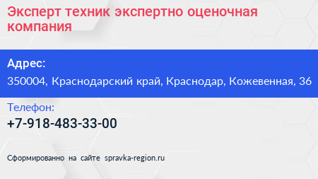 Эксперт-техник, экспертно-оценочная компания по адресу 350004, Краснодарский край, Краснодар, Кожевенная, 36 в дальнейшем Организация, размещена в следующих категориях: