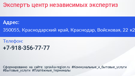 Экспертъ, центр независимых экспертиз по адресу 350055, Краснодарский край, Краснодар, Войсковая, 22 к2 в дальнейшем Организация, размещена в следующих категориях: