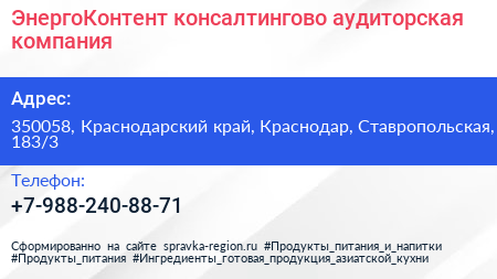 ЭнергоКонтент, консалтингово-аудиторская компания по адресу 350058, Краснодарский край, Краснодар, Ставропольская, 183/3 в дальнейшем Организация, размещена в следующих категориях: