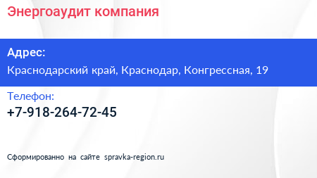 Энергоаудит, компания по адресу Краснодарский край, Краснодар, Конгрессная, 19 в дальнейшем Организация, размещена в следующих категориях: