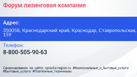 Форум, лизинговая компания по адресу 350058, Краснодарский край, Краснодар, Ставропольская, 159 в дальнейшем Организация, размещена в следующих категориях:
