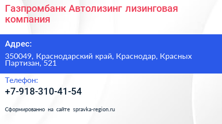 Газпромбанк Автолизинг, лизинговая компания по адресу 350049, Краснодарский край, Краснодар, Красных Партизан, 521 в дальнейшем Организация, размещена в следующих категориях: