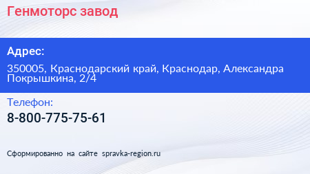 Генмоторс, завод по адресу 350005, Краснодарский край, Краснодар, Александра Покрышкина, 2/4 в дальнейшем Организация, размещена в следующих категориях: