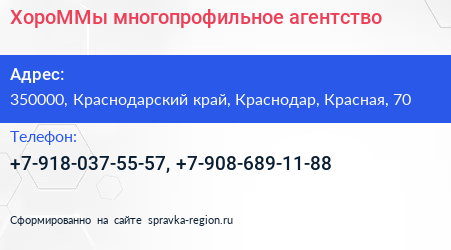 ХороММы, многопрофильное агентство по адресу 350000, Краснодарский край, Краснодар, Красная, 70 в дальнейшем Организация, размещена в следующих категориях: