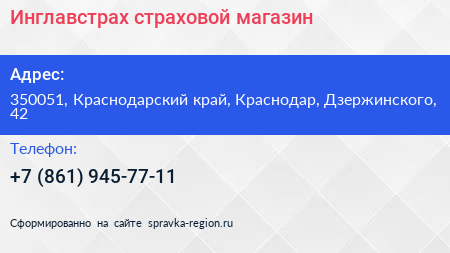 Инглавстрах, страховой магазин по адресу 350051, Краснодарский край, Краснодар, Дзержинского, 42 в дальнейшем Организация, размещена в следующих категориях: