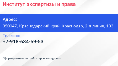 Институт экспертизы и права по адресу 350047, Краснодарский край, Краснодар, 2-я линия, 133 в дальнейшем Организация, размещена в следующих категориях: